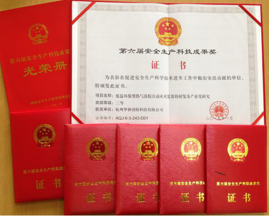近日,國家安全監(jiān)管總局《關于表彰第六屆安全生產科技成果獎的決定》(安監(jiān)總科技〔2015〕8號)公布,杭州華神消防科技有限公司研發(fā)的“低溫環(huán)保型熱氣溶膠自動滅火裝置的研發(fā)及產業(yè)化研究”項目獲得第六屆安全生產科技成果三等獎。這次獲獎,是在省、市、區(qū)各級安監(jiān)部門的高度重視和大力推薦下,通過華神公司科研人員刻苦攻關的成果。
