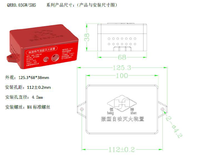 恒神微型熱氣溶膠滅火裝置是由引發(fā)器(電引發(fā)器/火災(zāi)探測線束)、熱氣溶膠發(fā)生劑和發(fā)生裝置、反饋元件及冷卻外殼等部件組成,無壓力容器、壓力閥等氣動元件,具有效期長,免維護,可靠性高的特點。